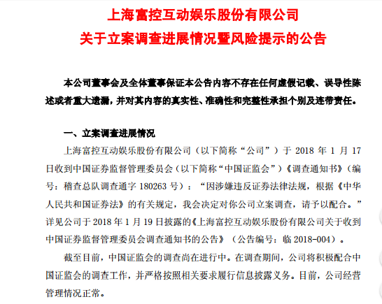 今日即4月17日,富控互动公告称,公司本身童谣遭到证监会立案调查。