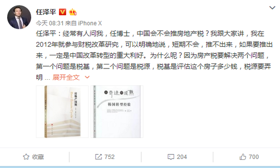 任泽平今日发布微 博表示,房地产税短期内难以推出,如果要推出来,也一定是中国改革转型的重大利好。