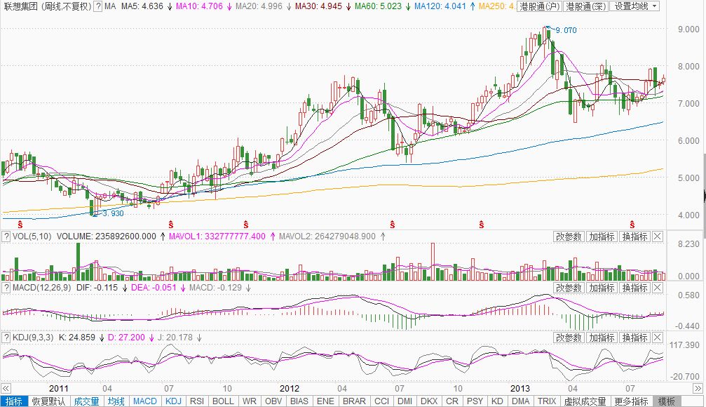 受益于业绩利好,联想的股价从在2012年1月开始攀升,而10月联想超过惠普成为全球第一大PC厂商的消息的刺激,联想股价拉出了一条漂亮的上升通道。其实,早年联想在移动手机领域也曾辉煌,2013年联想凭借机海战术成为国产智能手机销量冠军,全年手机总出货量超过了5000万台。