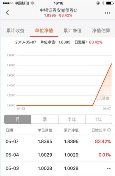 近两年来,基金净值暴涨的情形时有发生。在刚刚过去的四月份,也出现了基金净值单日暴涨两三倍的现象。近期,又有一只债基C份额单日大涨83.42%,引发市场关注。