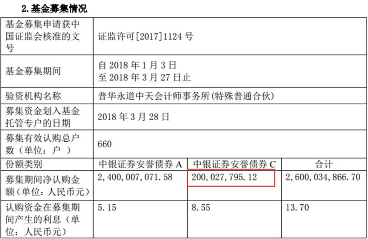 中银证券安誉C是一只刚成立一个多月的次新基金。公开资料显示,该基金是一只中长期纯债基金,于今年1月3日开始募集,3月29日正式成立,基金管理人为中银国际证券股份有限公司。募集有效认购总户数为660户,其中A、C份额分别募集了24亿份和2亿份。