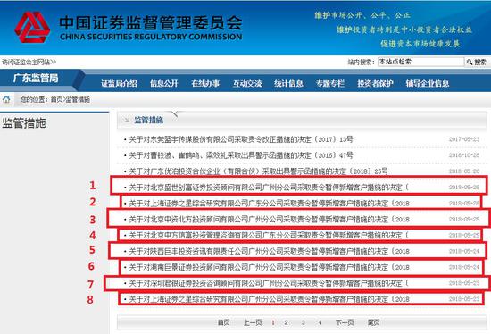 该类处罚也并非本月孤例。早在今年5月17日,浙江证监局网站就挂出了《关于对杭州顶点财经网络传媒有限公司采取责令暂停新增客户措施的决定》,直指其在业务开展中存在的违规行为,并暂停其新增客户,且未加期限说明。