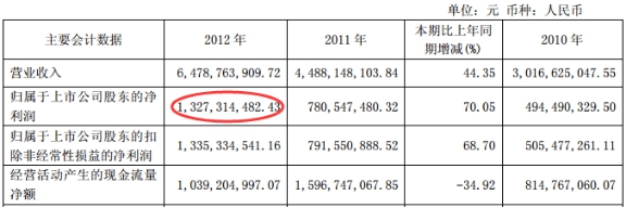 2012年山西汾酒实现营业收入64.78亿元,归属于上市公司股东的净利润13.27亿元,经营活动产生的现金流量净额10.39亿元。