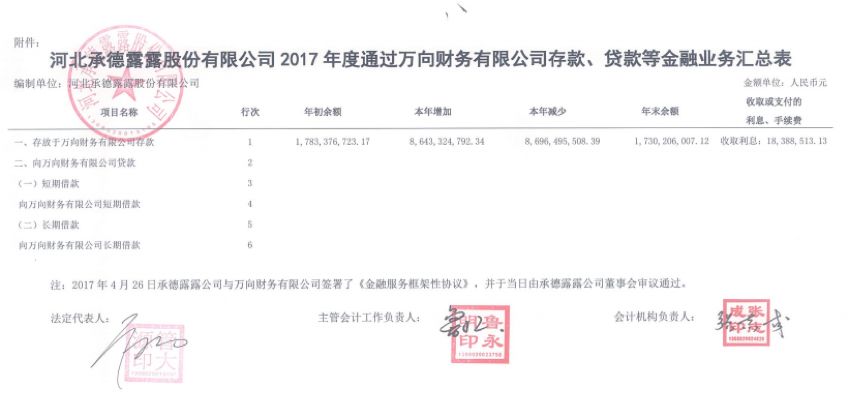 根据公司2017年度通过万向财务有限公司存款、贷款等金融业务汇总表,截止2017年底,承德露露与万向财务资金往来的累计发生额约86.24亿,年初与年末余额均超过了17亿,2017年,公司通过万向财务有限公司办理金融业务收取利息约1838.85万。