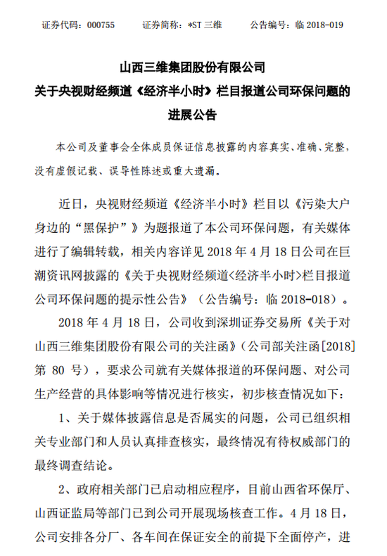 4月17日晚间,央视财经频道报道了*ST三维对周边环境严重污染的情况,*ST三维旋即卷入舆论漩涡。山西省环保厅迅速采取措施,第一时间开展实地调查。此外,临汾市连夜成立刑事调查专案组,对*ST三维负责环保工作的2名责任人进行询问。随后,包括地方国资、环保部门在内的多个部门,纷纷表示将对此事进行严查。